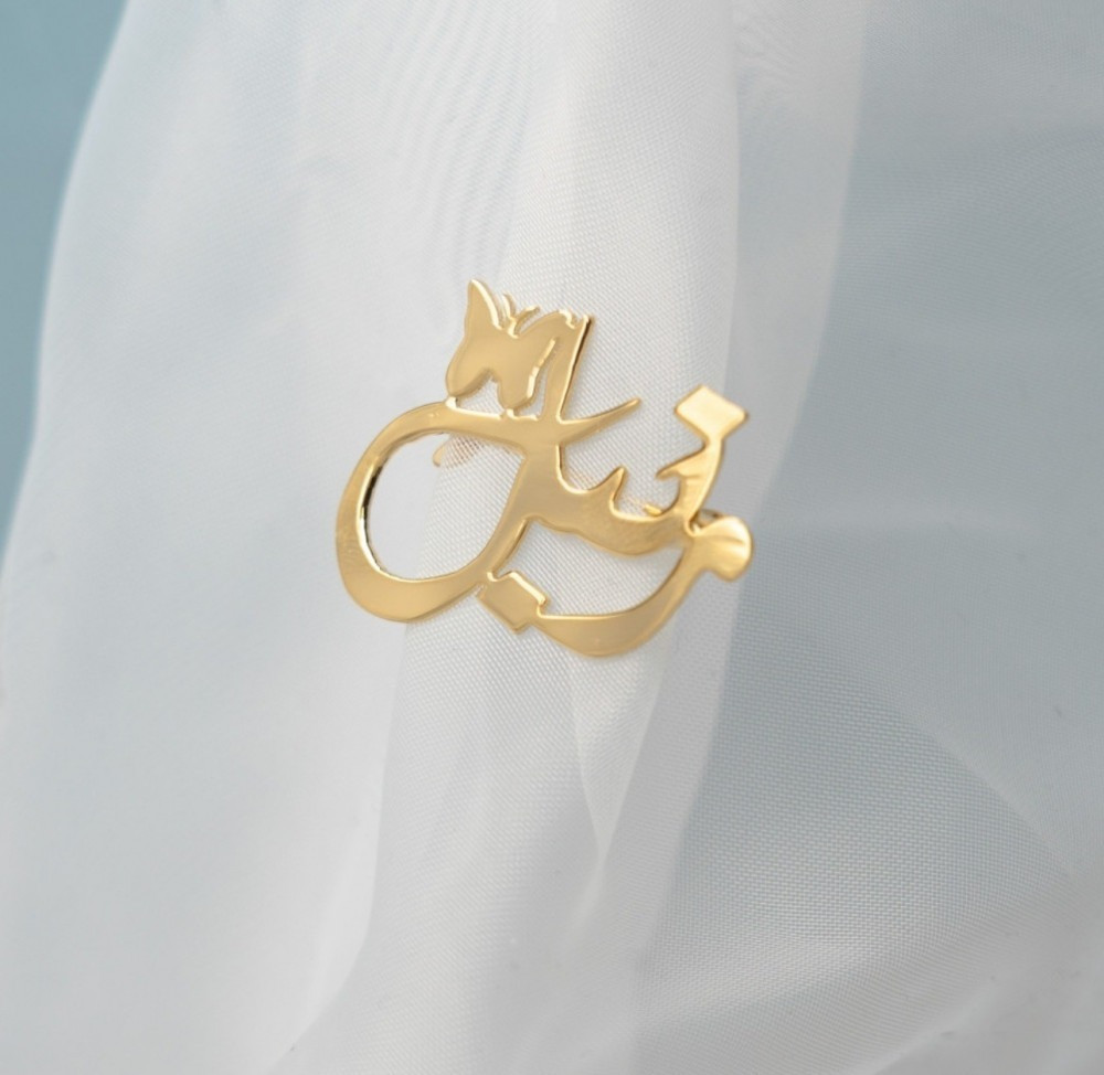 بروش ميكس الأصفر والأبيض يحمِل الإسم مع إضافة فراشة يتم صياغة الاسم حسب طلبك .. وذلك بأيدي صائغين مهرة في المصنع الخاص بـ مجوهرات بودل ..
