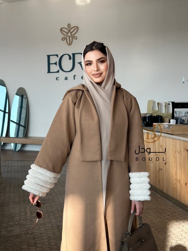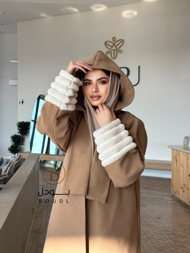 فروة شتوية مفتوحة صممت بطريقة عصرية ،منسوج من الجوخ ،أضيفت لها فرو المقلم الناعم في الاكمام ، أعطاها مظهر شتوي راقي وجميل ..ملاحظة :المقاسات مثل مقاس العباية العاديةكمية محدودة